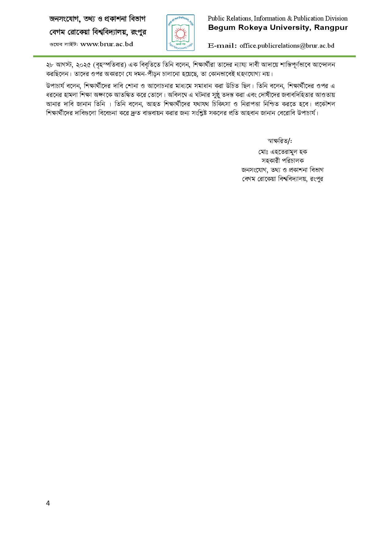 বেরোবি প্রশাসন কর্তৃক বিভিন্ন পদক্ষেপ ও উদ্যোগের হালনাগাদ তথ্য (আগস্ট, ২০২৫)